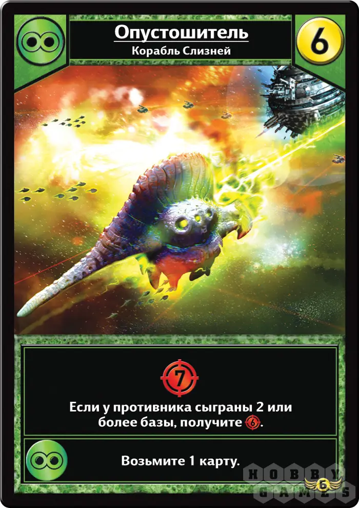 В основную фазу вы можете разыгрывать карты, использовать различные их свойства, совершать покупки и атаковать противника. Сами карты могут быть нескольких типов – кораблями и базами. Их действия сильно отличаются друг от друга. Свойства кораблей разыгрываются сразу, а карта лежит до конца вашего хода. Базы же не сбрасываются, а остаются лежать перед вами до тех пор, пока не будут разрушены. Более того, помимо своих свойств и бонусов, базы-аванпосты заставляют противника атаковать сначала себя, тем самым защищая ваши прочие базы и вас лично – основную цель врага.