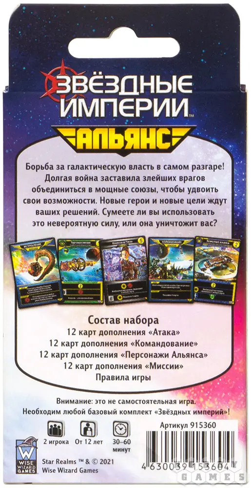 "Звёздные империи" – колодостроительная игра на космическую тематику для 1-6 человек. Игрокам предстоит собрать свой флот, оборудовать базы и аванпосты, а затем атаковать друг друга для снижения очков влияния противника. Все игроки начинают в равных условиях с личной колодой карт кораблей. Докупая карты в свою колоду и используя различные комбинации карт с уникальными свойствами, игроки сами придумывают стратегию во время партии: вырабатывают защиту от атак противника и ищут бреши в обороне противника. Можно пользоваться силой, хитростью или богатством, но для победы всем игрокам одинаково понадобятся мастерство, интуиция и хладнокровный расчёт!