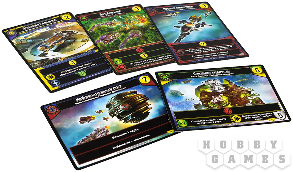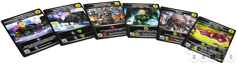 Карты обладают различными свойствами, которые применяются в различные фазы хода и дают вам уникальные бонусы или способности, на которых и будет построена ваша стратегия победы. С помощью карт приобретают очки боя, торговли или влияния – это ваши основные ресурсы на игру.