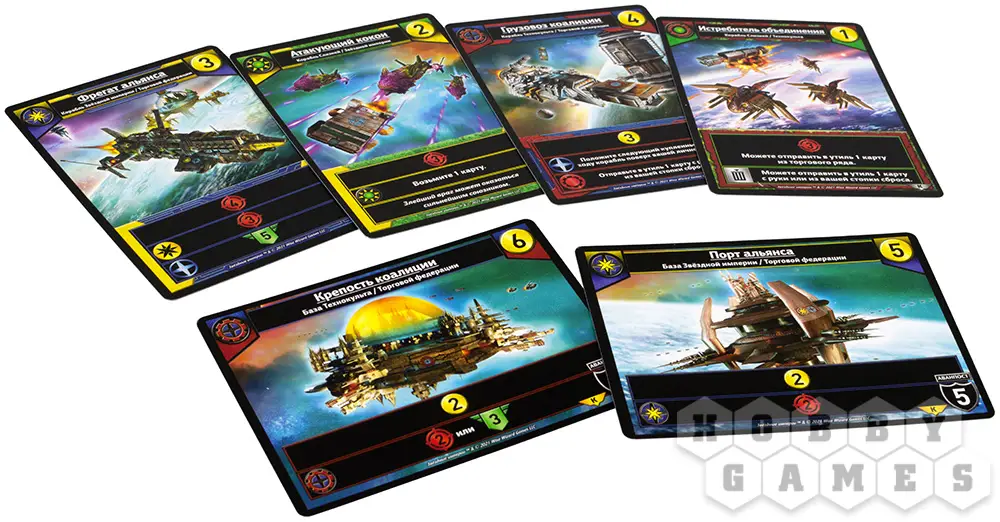 В основную фазу вы можете разыгрывать карты, использовать различные их свойства, совершать покупки и атаковать противника. Сами карты могут быть нескольких типов – кораблями и базами. Их действия сильно отличаются друг от друга. Свойства кораблей разыгрываются сразу, а карта лежит до конца вашего хода. Базы же не сбрасываются, а остаются лежать перед вами до тех пор, пока не будут разрушены. Более того, помимо своих свойств и бонусов, базы-аванпосты заставляют противника атаковать сначала себя, тем самым защищая ваши прочие базы и вас лично – основную цель врага.