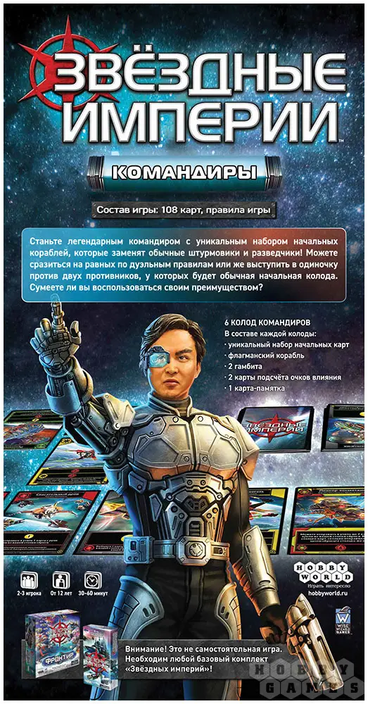 Дополнение "Звёздные империи: Командиры" предоставляет игрокам ещё больше возможностей и средств в борьбе за господство в космическом пространстве. В коробке вы найдёте 6 колод командиров, каждая из которых включает в себя стартовую руку из двенадцати карт, 2 гамбита, флагманский корабль, а также 2 карты подсчёта очков влияния и памятку. Кроме того, с этим дополнением можно сыграть как в классический дуэльный вариант "Звёздных империй", так и попытать счастья в одиночку дать отпор сразу против двоих соперников. Объедините под своим началом всё лучшее от двух фракций и воспользуйтесь преимуществом!