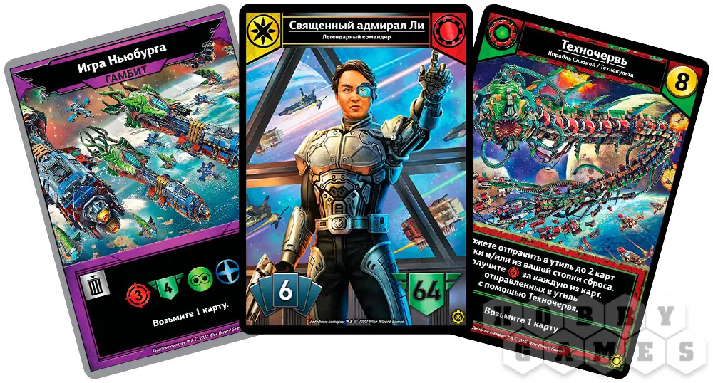 Карты обладают различными свойствами, которые применяются в различные фазы хода и дают вам уникальные бонусы или способности, на которых и будет построена ваша стратегия победы. С помощью карт приобретают очки боя, торговли или влияния – это ваши основные ресурсы на игру.