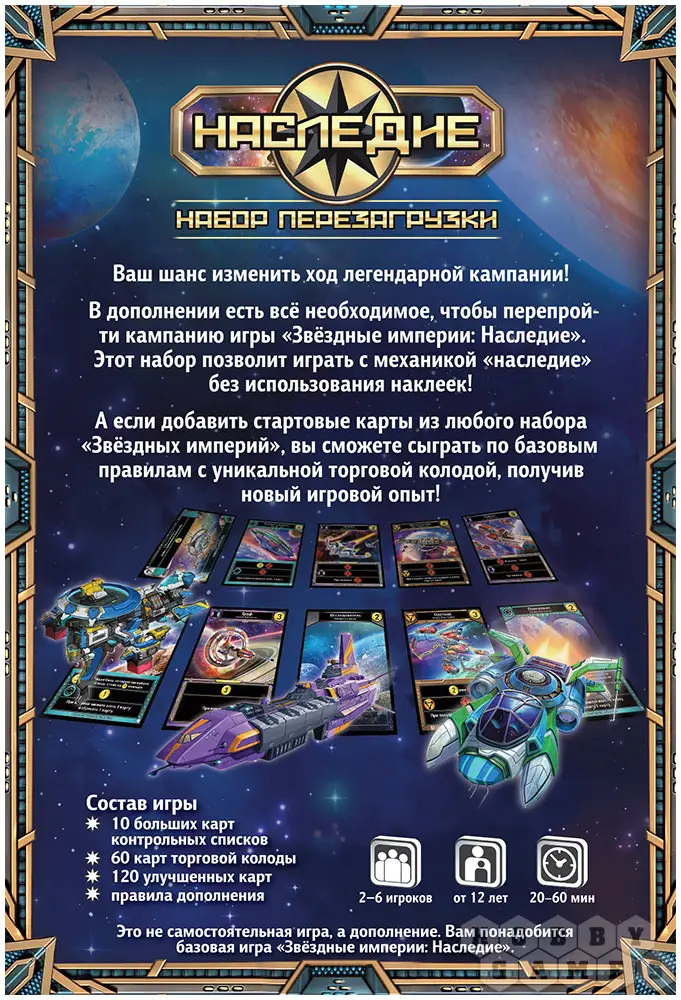 "Звёздные империи: Наследие" – это колодостроительная космическая стратегия с полноценной сюжетной кампанией, где каждый сценарий открывает новые карты, фракции и правила. Игра создана на основе серии "Звёздные империи", поэтому поклонники быстрее вольются в процесс, а новички смогут легко освоиться. По мере прохождения вы будете улучшать корабли и базы, влиять на торговую колоду, получать новые сценарные цели и усиливать влияние своей стороны. После завершения кампании набор превратится в полноценную игру для 2-6 человек, а ещё его можно будет сочетать с другими коробками серии!
