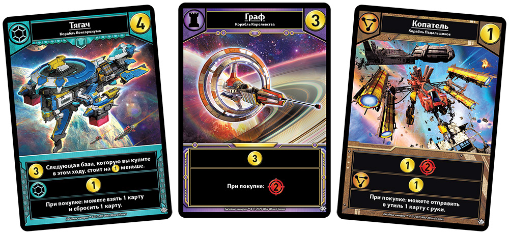 После основной фазы наступает фаза сброса. Она довольно короткая: вы просто обнуляете оставшиеся очки торговли и боя, а также сбрасываете разыгранные корабли и карты с руки.